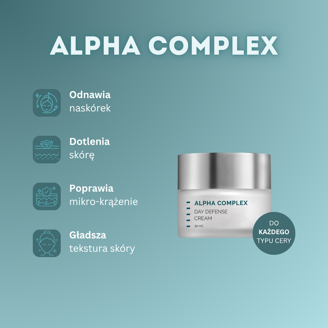 Alpha Complex Day Defense Cream – to krem na dzień na bazie mieszanki naturalnych kwasów AHA. Stymuluje odnowę komórkową naskórka i redukuje zmarszczki. Chroni skórę przed szkodliwym działaniem promieni słonecznych.
