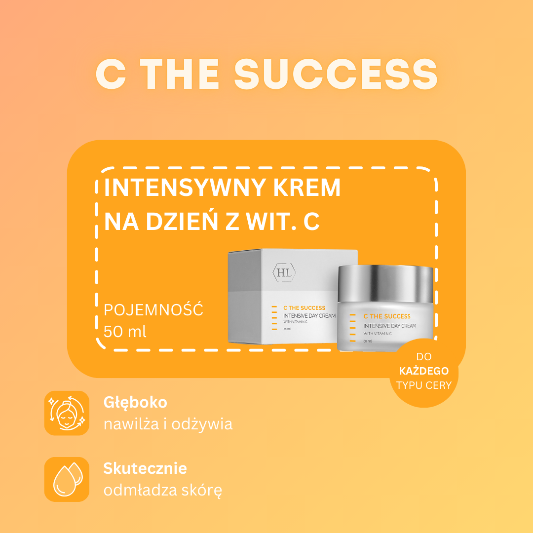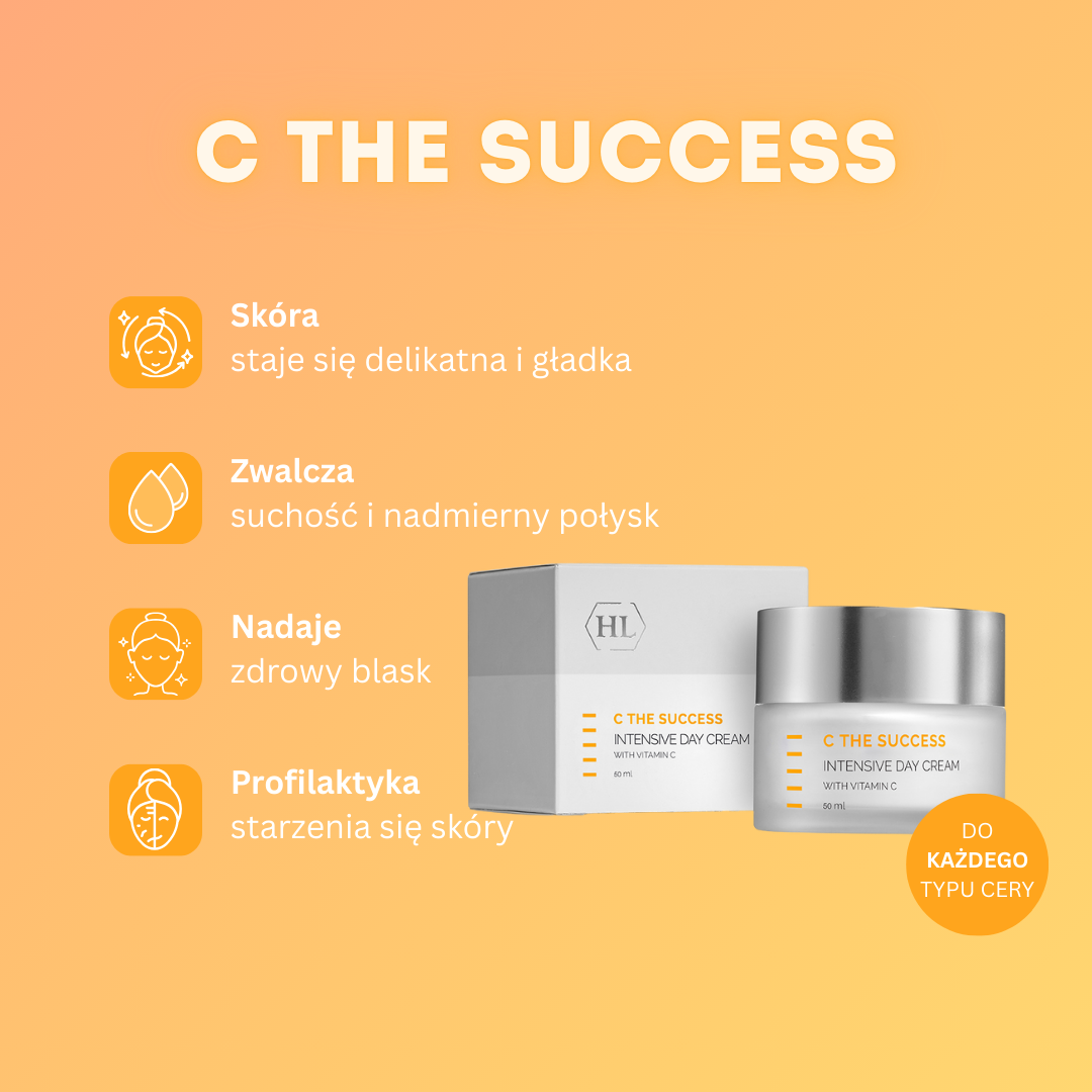 C The Success Intensive Day Cream – to krem na dzień z witaminą C. C The Success Intensive Day Cream opóźnia proces starzenia się skóry, redukuje zmarszczki i zwiększa poziom nawilżenia. Witamina C jest skutecznym przeciwutleniaczem, który, wchłaniając się w najgłębsze warstwy cery, neutralizuje wolne rodniki. Dodatkowo krem na dzień z witaminą C wpływa na wytwarzanie melaniny, wzmacnia syntezę kolagenu i elastyny, rozjaśnia i odnawia skórę, zapewniając jej zdrowy i piękny wygląd.