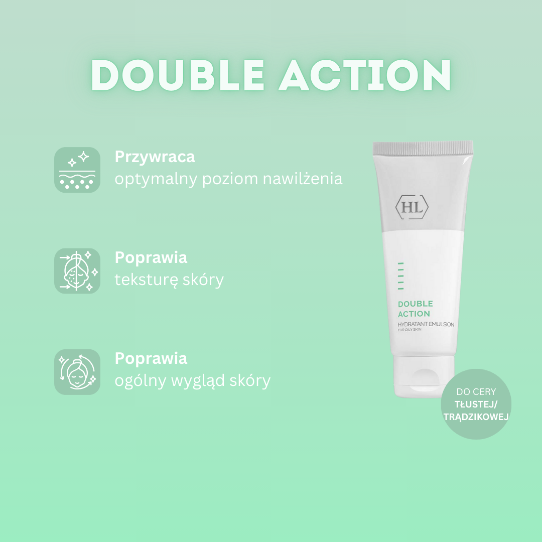 Linia Double Action przeznaczona jest do skóry problemowej, tłustej, trądzikowej. W rezultacie produkty dezynfekują, przyspieszają gojenie się skóry, regulują wydzielanie sebum, zapobiegają pojawieniu się zaskórników i tłustemu połyskowi. Co więcej preparaty linii Double Action redukują stany zapalne, zmniejszają rozszerzone pory i poprawiają ogólną strukturę skóry. Oprócz produktów do zabiegów profesjonalnych, linia zawiera także produkty do uzupełniającej kuracji domowej.