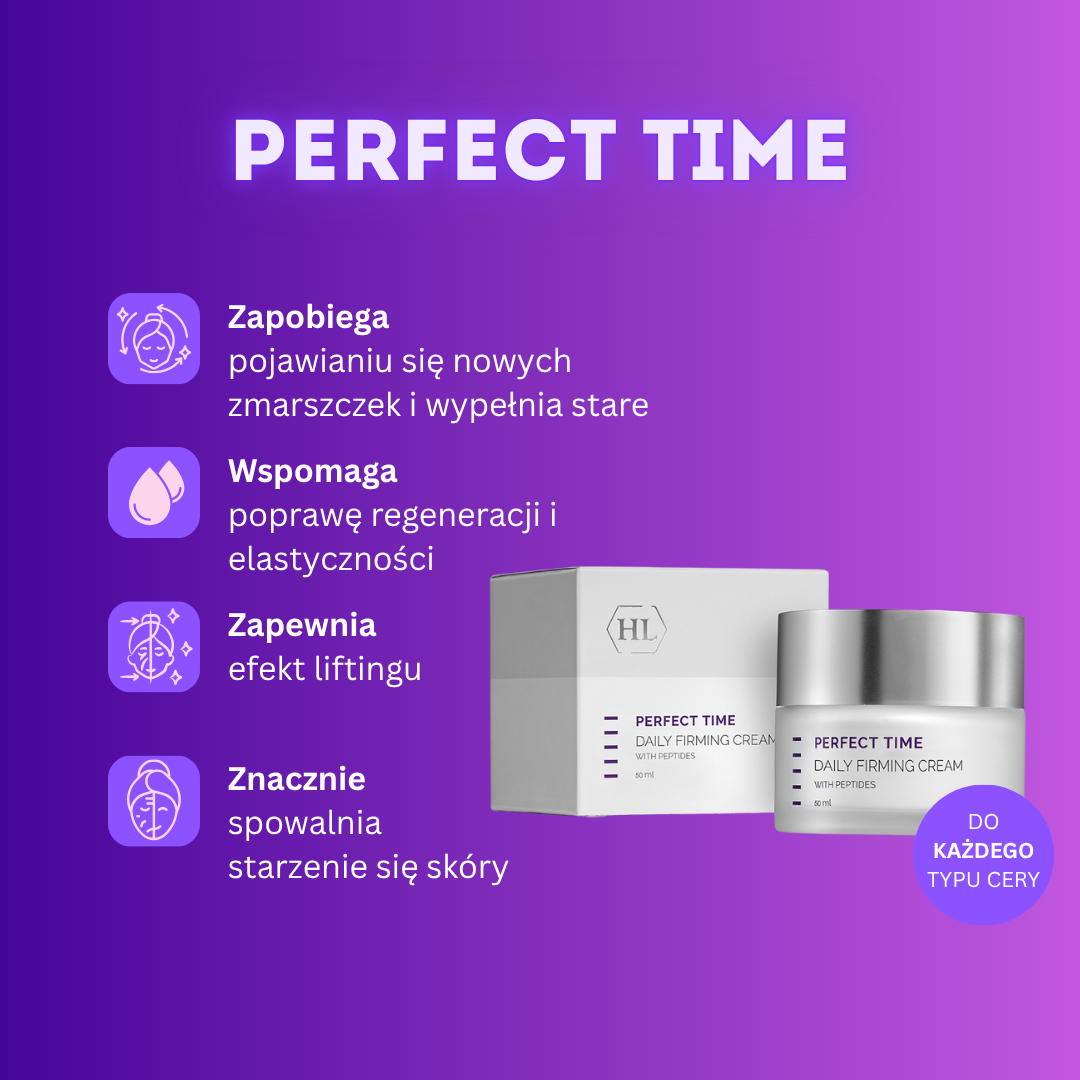Perfect Time Daily Firming Cream – to szczególnie aktywny ujędrniająco-odmładzający krem na dzień. Krem zawiera kompleks unikalnych peptydów, które pomagają w spłyceniu zmarszczek, jednocześnie zapobiegając powstawaniu nowych.  Ponadto w składzie tego kremu na dzień znajduje się ekstrakt z soi oraz fitoestrogeny z dzikiego pochrzynu, wzmacniające teksturę skóry. Co więcej Perfect Time Daily Firming Cream zawiera podstawowe aminokwasy, które pomagają uzyskać efekt liftingu oraz poprawiają elastyczność skóry.