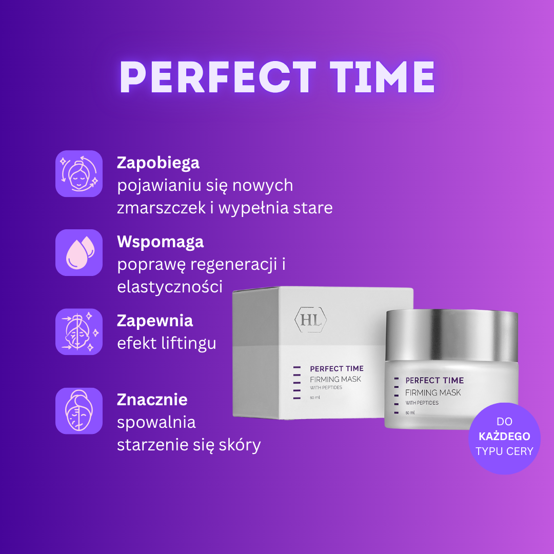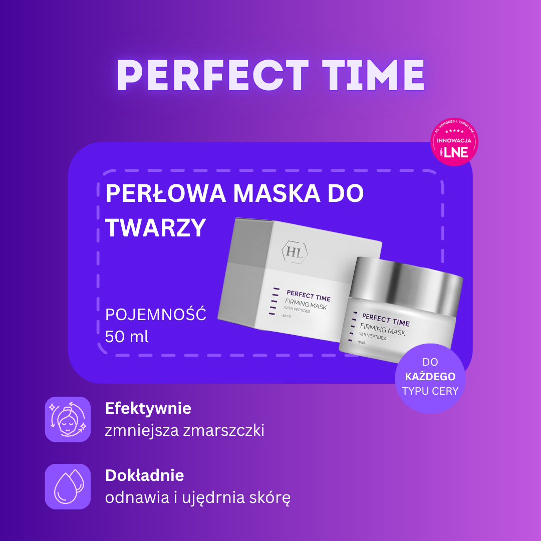 Linia Perfect Time bazuje na wysokiej jakości składnikach: innowacyjnych funkcjonalnych lipo-peptydach oraz podstawowych aminokwasach. Produkty ujędrniają, dają efekt liftingu, wygładzają skórę, zapewniając wzmocnienie konturu twarzy, szyi i dekoltu. Linia przeznaczona do każdego typu cery, zwłaszcza do skóry dojrzałej. Co więcej za skuteczność i innowacyjność linia Perfect Time otrzymała  nagrody „Innowacja 35. Kongresu i Targów LNE” oraz „Inspiracje Roku 2019. Beauty Inspiration”.