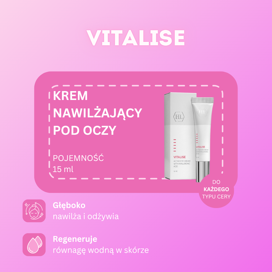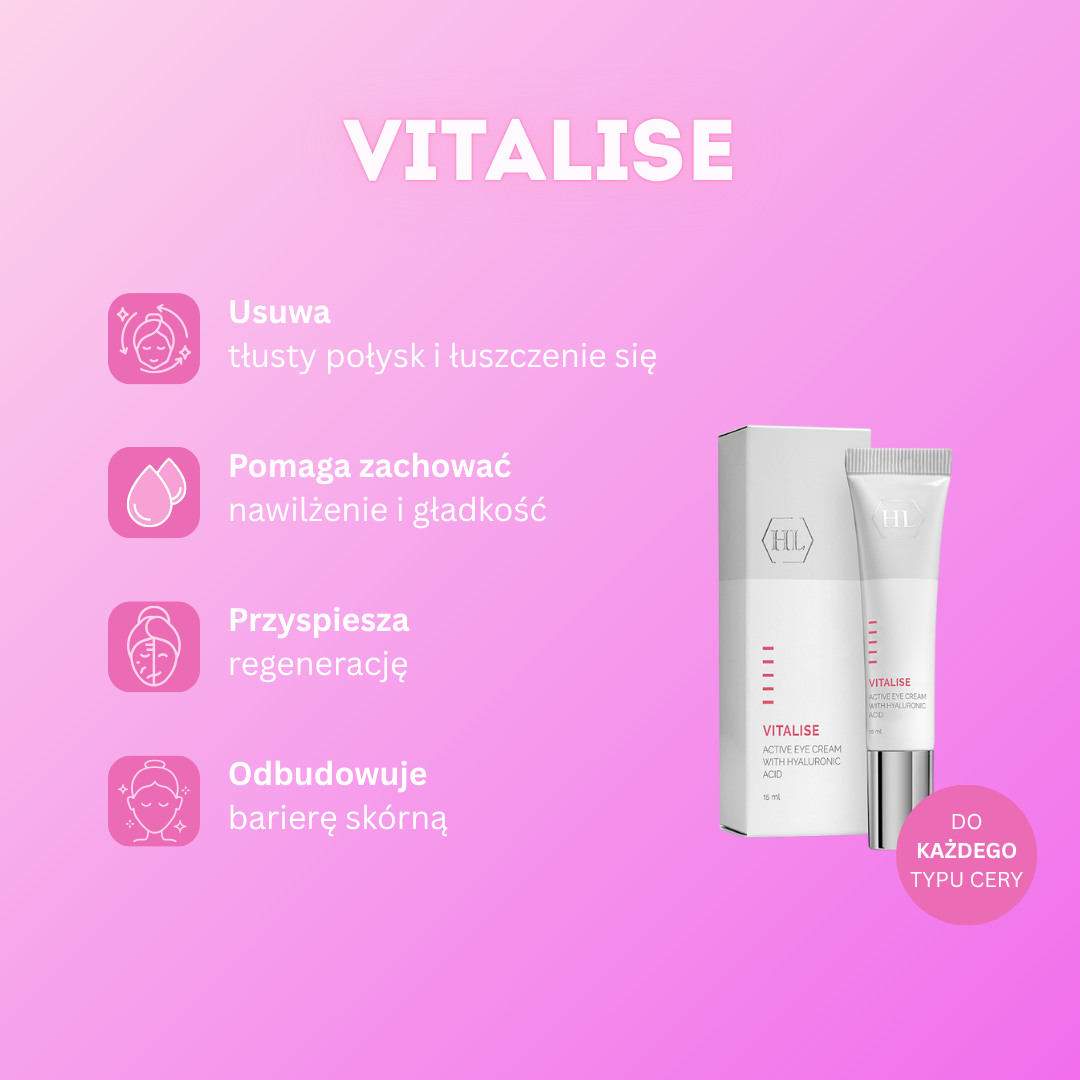 Vitalise Active Eye Cream – to intensywnie nawilżający krem pod oczy, opracowany na bazie kwasu hialuronowego i witaminy E. Kwas hialuronowy poprawia zdolność skóry do zatrzymywania wody i optymalizuje funkcjonowanie bariery skórnej. Ponadto redukuje linie i bruzdy, znacznie zwiększa jędrność skóry, zapewnia jej jedwabiście gładki wygląd. W rezultacie produkt nawilża, spłyca zmarszczki mimiczne, poprawia elastyczność i sprężystość skóry.